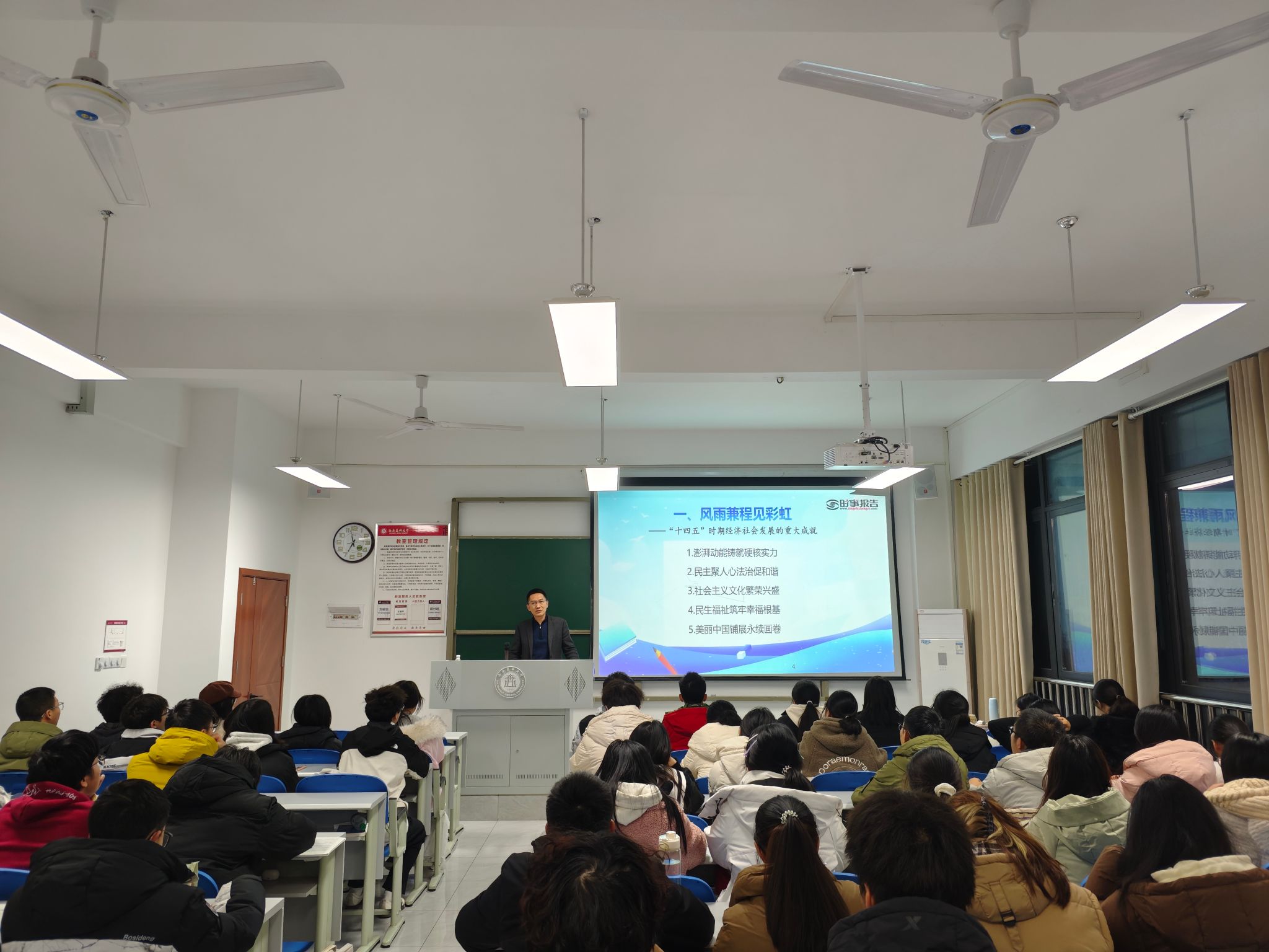 12月8日,学校党委常委、副校长江涌走进思政课堂,在文渊楼601室为2025级基础医学、临床医学专业学生讲授了一堂以《决胜“十四五”奋发向前行》为主题的“形势与政策”课。