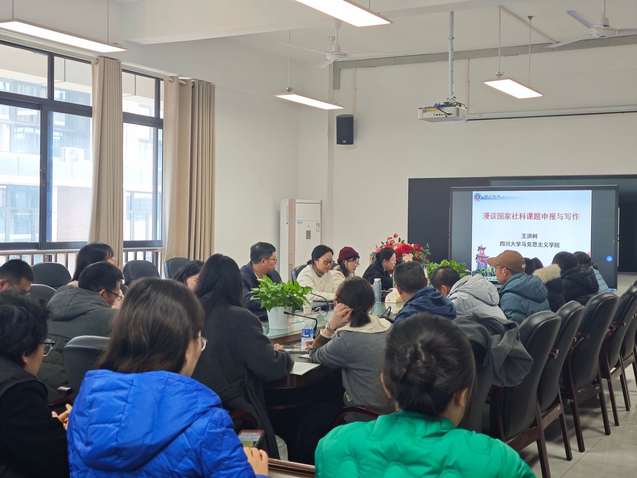 12月5日,马克思主义学院在文渊楼432室举办“新时代高校思政课教师综合素养提升”系列讲座暨第三十四期“智周求道”学术讲座。讲座特邀四川大学马克思主义学院副院长王洪树教授担任主讲嘉宾,以“漫谈国家社科课题申报与写作”为主题,为与会教师带来了一场兼具理论深度与实践指导的精彩报告。讲座由学院党委书记张圆主持,学院全体无课教师、泸州医疗器械职业学院马克思主义学院教师代表参加活动。